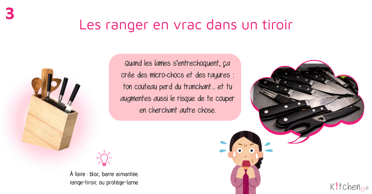 Un rangement inadapté compromet donc à la fois la qualité du couteau et la sécurité d’utilisation.